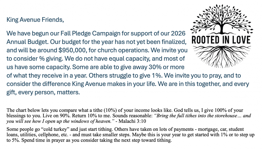 Please prayerfully consider your support for King Avenue, our community, ROOTED IN LOVE! These weeks in worship are not just about funding a budget, but about forming a community of disciples in the service of Christ’s vision, we who resist the culture of scarcity and self-interest and live into the abundance of God’s grace and heed the call to love our neighbors as ourselves.